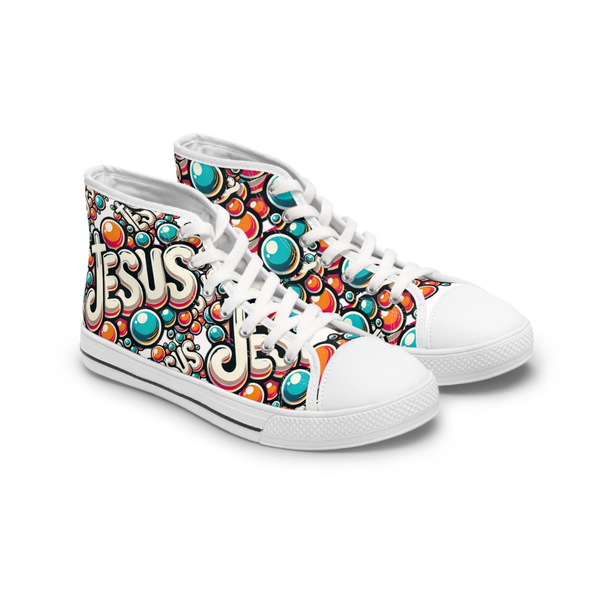 Step out in style with these high-top sneakers, designed for both comfort and flair. Perfect for those who love to express their individuality, these shoes feature a vibrant and unique design that adds a pop of color to any outfit. Whether you’re heading to a casual outing, a music festival, or just hanging out with friends, these sneakers are sure to turn heads. Ideal for women who appreciate trendy and comfortable footwear, they make a great gift for birthdays, holidays, or just because! Celebrate your love for fashion and express your faith with a pair that speaks volumes. Wear them on casual Fridays, during family gatherings, or any occasion where you want to stand out and feel good. These sneakers will bring a cheerful vibe to your wardrobe! Product features - Metal eyelets for added durability - Black p leather round toe for enhanced longevity - Soft, breathable 100% polyester canvas. - Shock-absorbing EVA insole for maximum comfort - Full wraparound print for a captivating 360° look Care instructions - To maintain clean, use warm water with dish soap to clean off any dirt spots. It’s not necessary to soak the whole item. For hard-to-clean spots, use a soft-bristled brush.