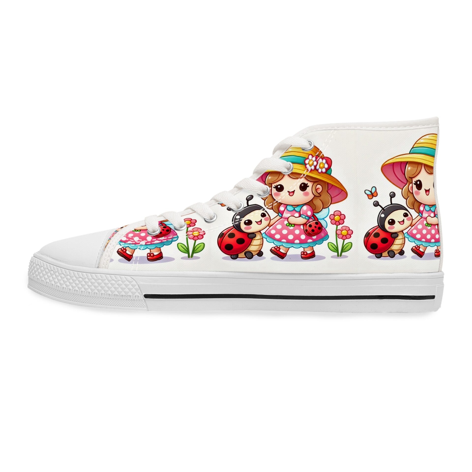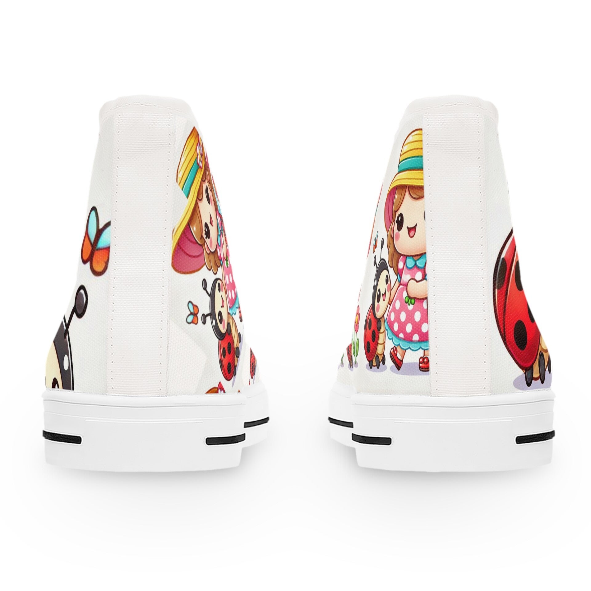 Cheerful Little Girl and Baby Ladybug, Fun, Festive and Very Playful Casual Footwear High Top Sneakers for Women and Girls, Perfect for Every Occasion
