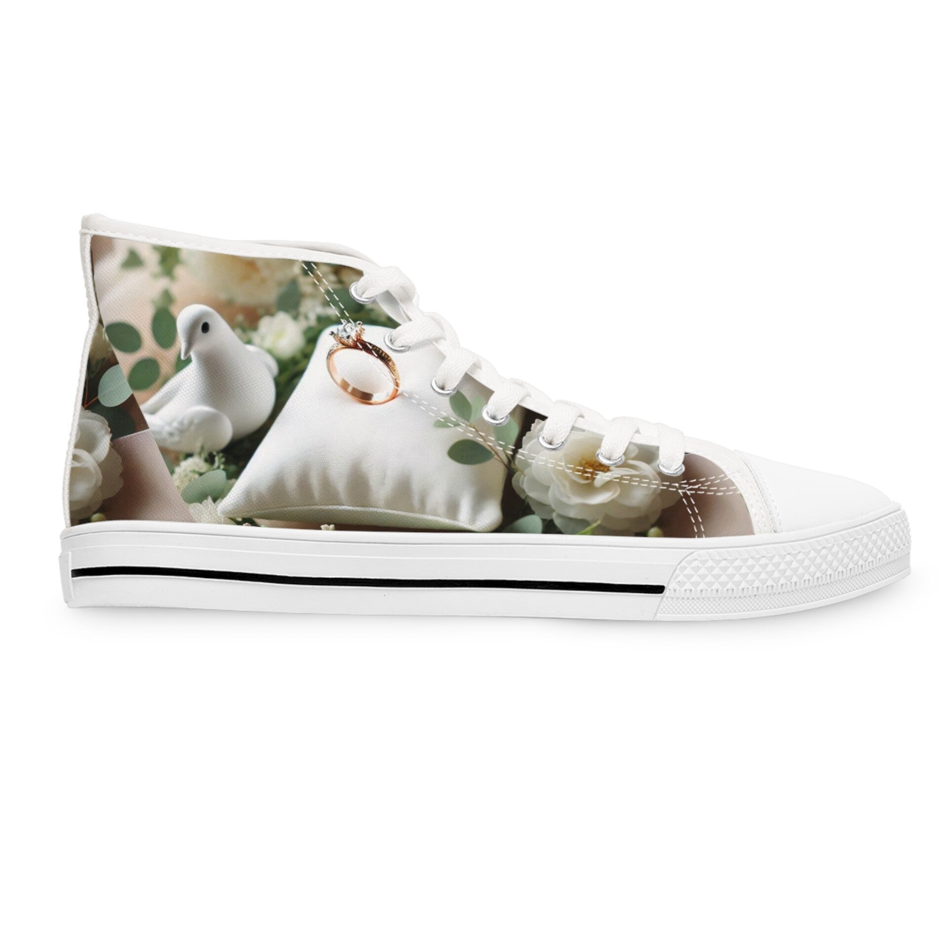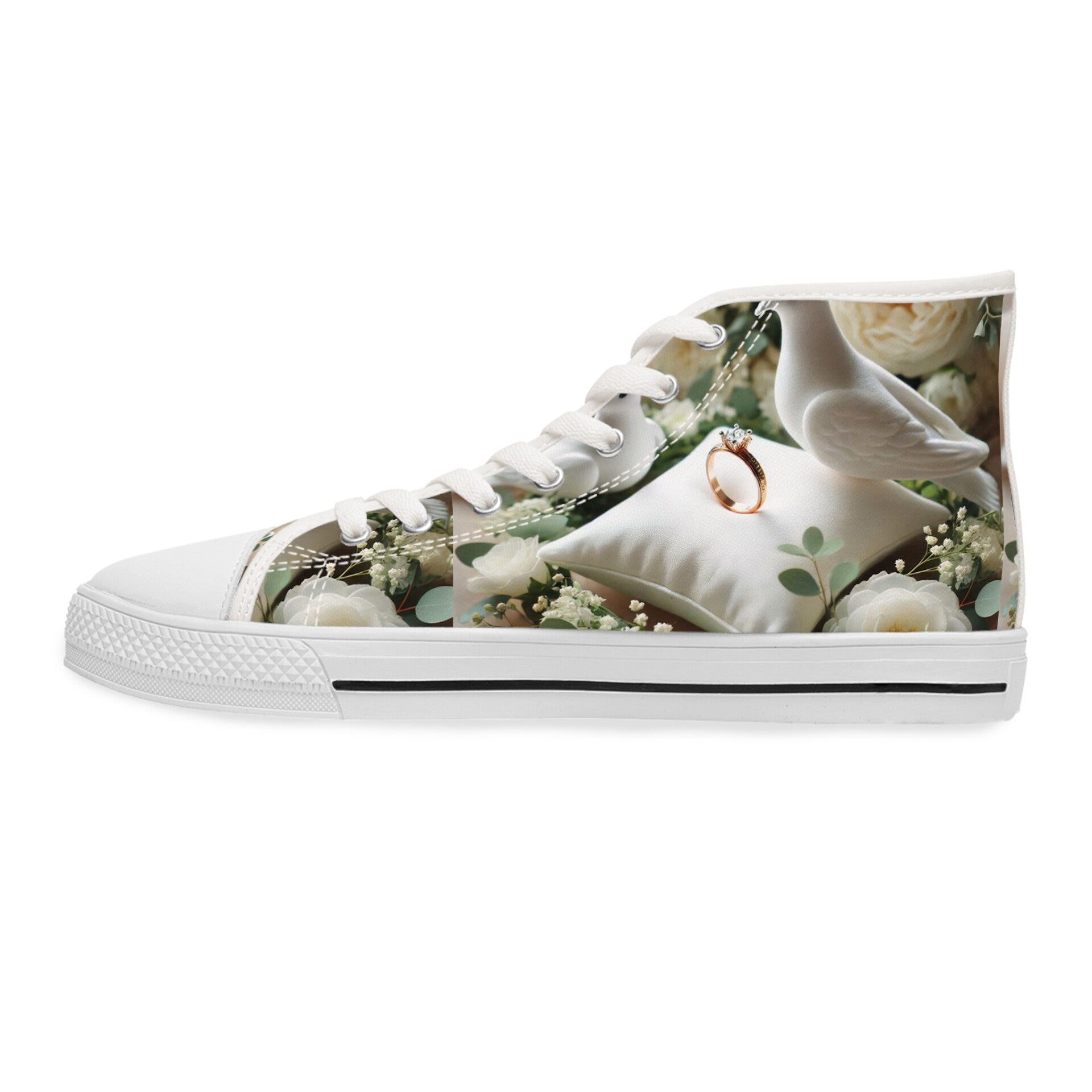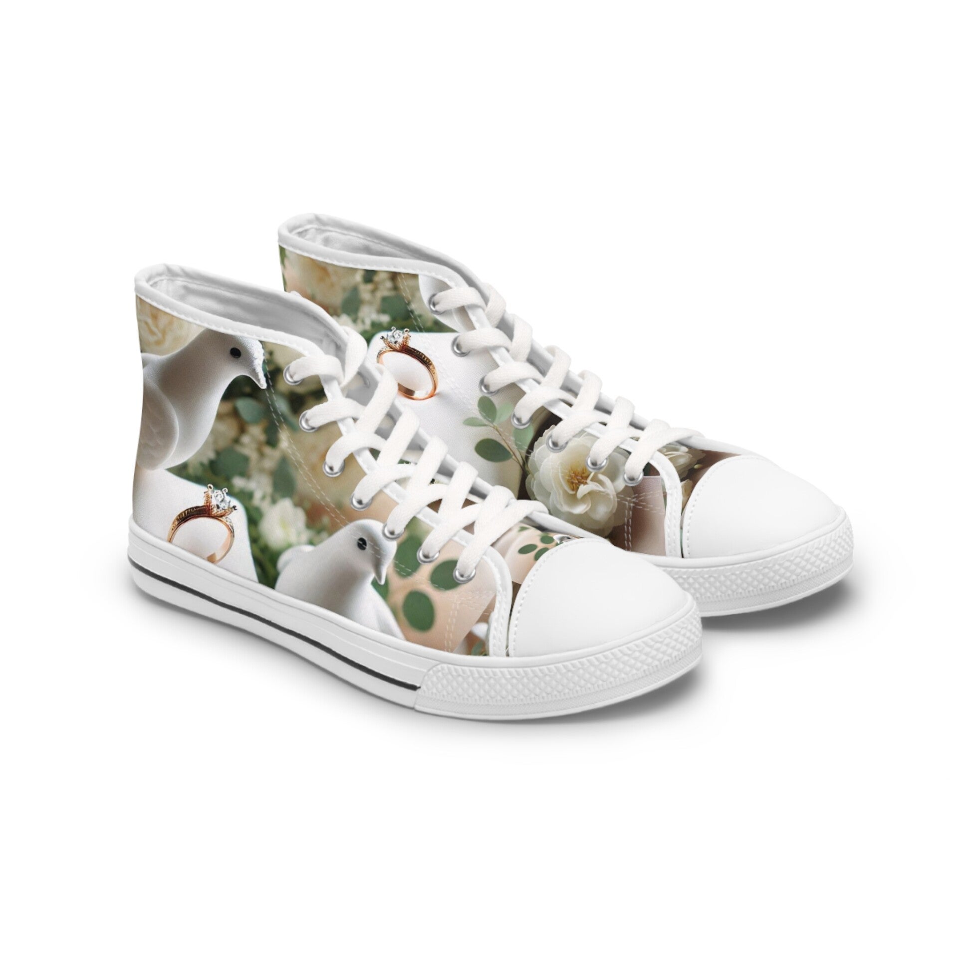 Step into style and comfort with these Women's High Top Sneakers. Featuring a unique design, these sneakers offer a perfect blend of fashion and functionality. The breathable polyester canvas ensures that your feet stay cool throughout the day, while the EVA insoles provide exceptional cushioning for all-day comfort. Ideal for casual outings, workouts, or simply hanging out with friends, these sneakers are a versatile addition to any wardrobe. The chic and modern aesthetic makes them suitable for celebrations like birthdays and holidays, or just a stylish day out. Perfect for trendsetters, fitness enthusiasts, and anyone who values both style and comfort in their footwear, these sneakers are a must-have for your collection! Product features - Metal eyelets for durability - Pleather round toe for added strength - Soft, breathable polyester canvas - EVA insoles for shock absorption - Durable rubber outsole for traction Care instructions - To maintain clean, use warm water with dish soap to clean off any dirt spots. It’s not necessary to soak the whole item. For hard-to-clean spots, use a soft-bristled brush.
