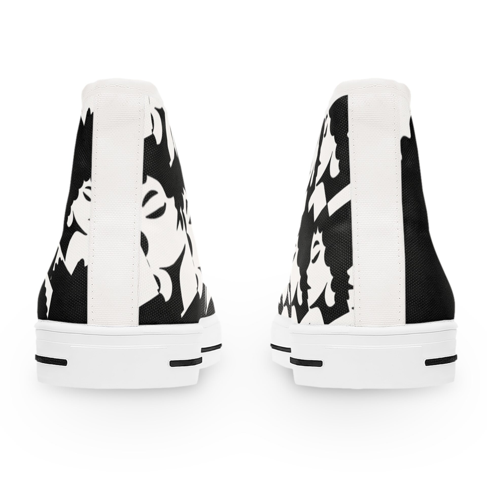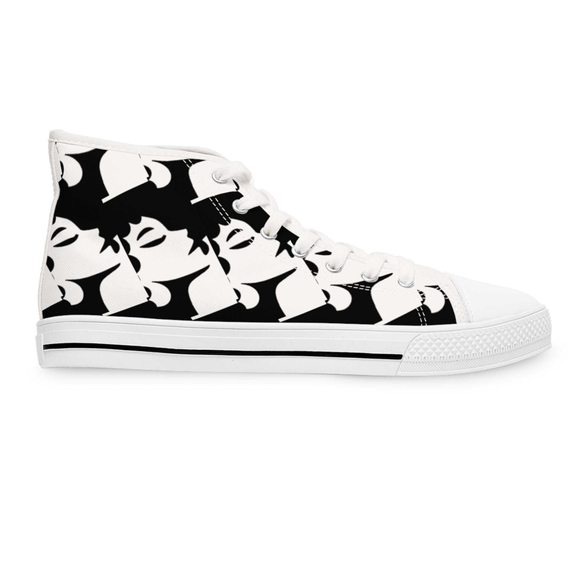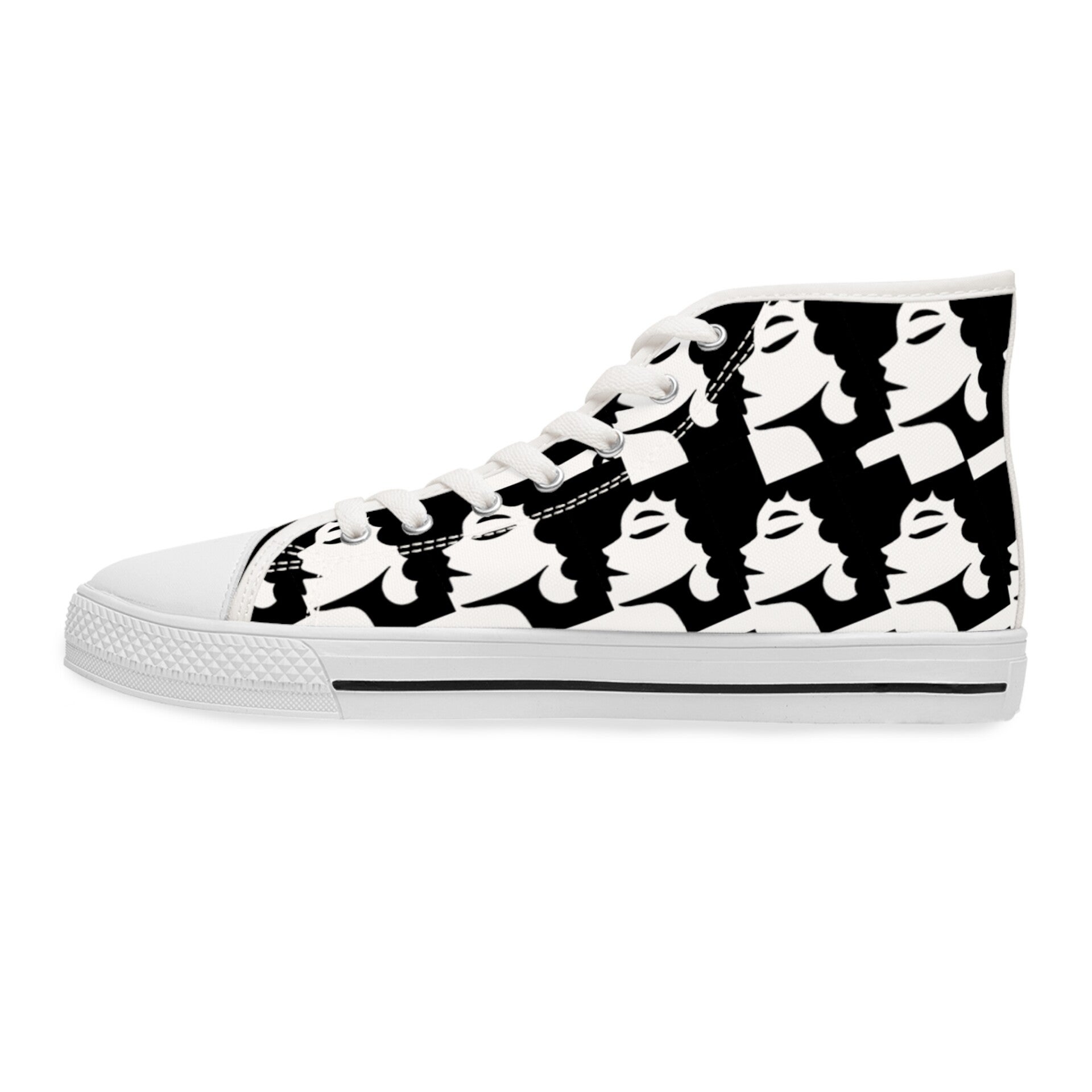 Made with breathable polyester canvas and featuring hi-poly deodorant memory foam insoles, these women's high top sneakers bear all the marks of an awesome shoe. Choose between black or white sole and laces, and enjoy the silver metal eyelets along with the lace-up closure. Add your designs and bring a bespoke staple to life. .: Breathable polyester canvas with PU leather decoration .: EVA deodorant memory foam insoles .: Full wraparound print (left side, right side, tongue) .: Durable rubber outsole .: Black or white decoration