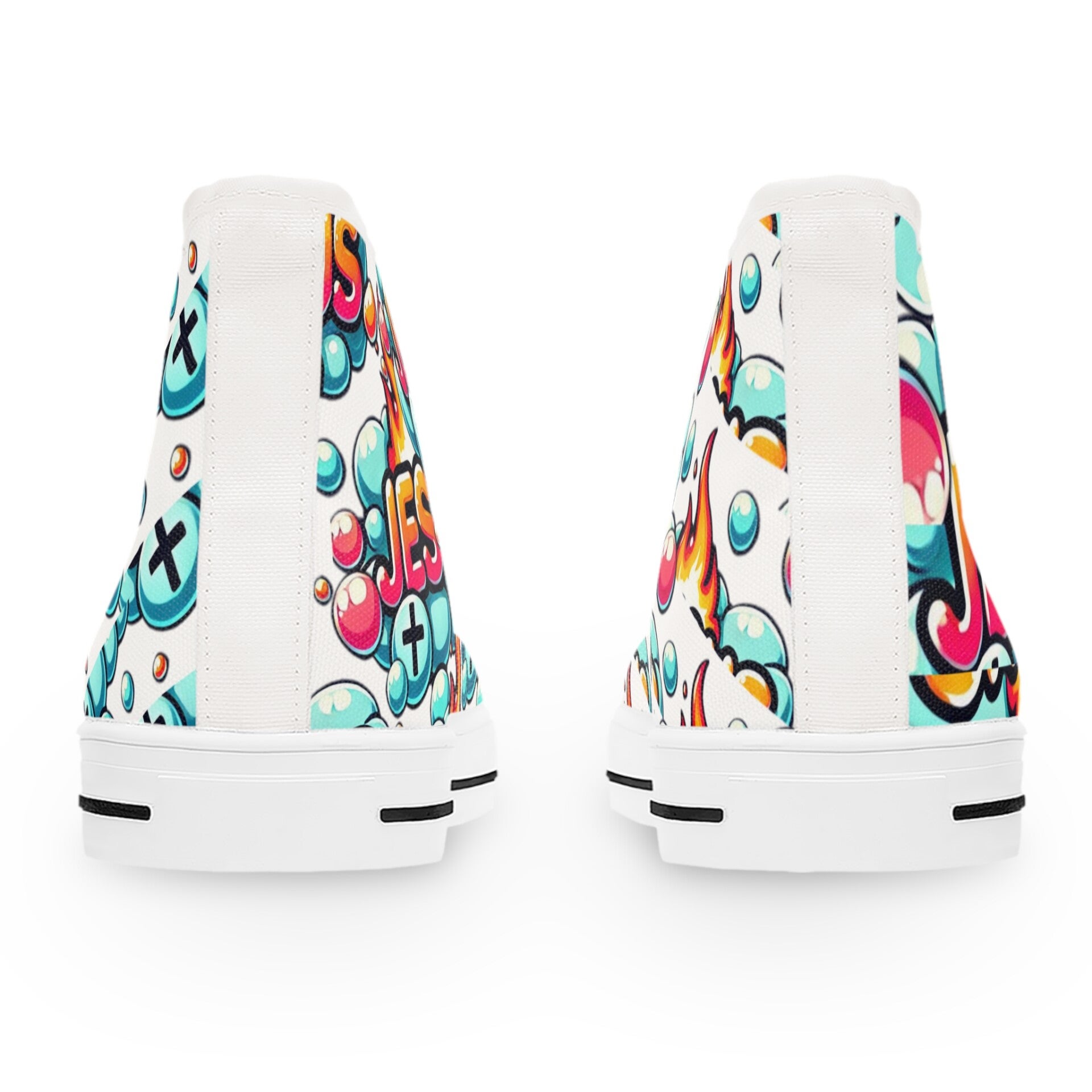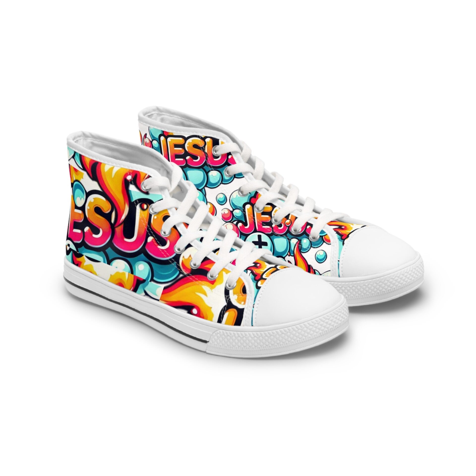 Step out in style with these high-top sneakers, designed for both comfort and flair. Perfect for those who love to express their individuality, these shoes feature a vibrant and unique design that adds a pop of color to any outfit. Whether you’re heading to a casual outing, a music festival, or just hanging out with friends, these sneakers are sure to turn heads. Ideal for women who appreciate trendy and comfortable footwear, they make a great gift for birthdays, holidays, or just because! Celebrate your love for fashion and express your faith with a pair that speaks volumes. Wear them on casual Fridays, during family gatherings, or any occasion where you want to stand out and feel good. These sneakers will bring a cheerful vibe to your wardrobe! Product features - Metal eyelets for added durability - Black p leather round toe for enhanced longevity - Soft, breathable 100% polyester canvas. - Shock-absorbing EVA insole for maximum comfort - Full wraparound print for a captivating 360° look Care instructions - To maintain clean, use warm water with dish soap to clean off any dirt spots. It’s not necessary to soak the whole item. For hard-to-clean spots, use a soft-bristled brush.
